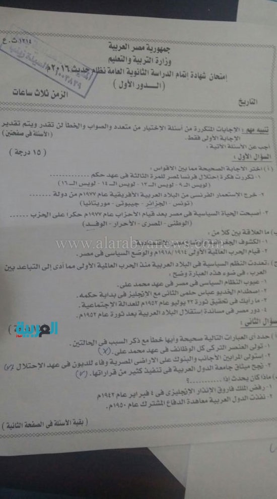 ومن جانبه أوضح أيمن البيلي، مؤسس جبهة تحرير نقابة المعلمين، أن هناك خطأ فى امتحان التاريخ اليوم فى السؤال الثانى (ج) رقم (3)، وضح مايلى أسباب عقد مؤتمر مؤتمر الجزيرة 1878م التاريخ الصحيح هو المؤتمر 1906م وليس 1878، مشيرا إلى أن الإجابة الصحيحة بالكتاب المدرسى ص 99 السطر الخامس من أسفل الصفحة (باللون الأزرق).