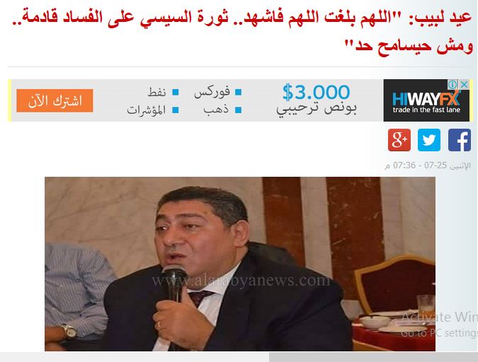 وكان "العربية نيوز" نشر تصريحات لعيد لبيب رجل الأعمال في خبر بعنوان : "اللهم بلغت اللهم فاشهد.. ثورة السيسي على الفساد قادمة.. ومش حيسامح حد"، تضمنت تحذيره من غضب الرئيس عبدالفتاح السيسي، مشيرا إلى أنه قادم لامحالة، لافتًا إلى وجود عدة أسباب لذلك، ومنها تحذير "الرئيس" من الفساد ومطالبته بضرورة محاربته أكثر من مرة.