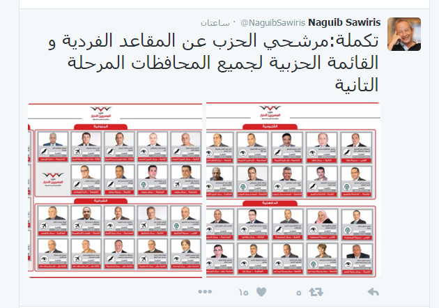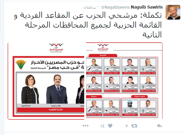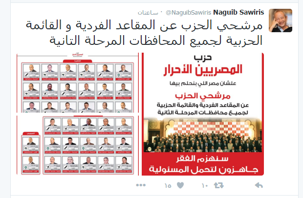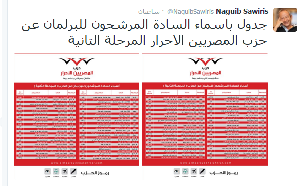"ساويرس" يستعرض مرشحي "المصريين الأحرار" بالأسماء والصور الخميس 19/نوفمبر/2015 - 08:57 م 11/19/2015 8:57:43 PM اسماء الشنديدي المهندس نجيب ساويرس نشر المهندس نجيب ساويرس مؤسس حزب "المصريين الأحرار" أسماء مرشحي الحزب في المرحلة الثانية من الانتخابات البرلمانية مدعومة بصورهم وذلك على حسابه الشخصي بموقع التواصل الاجتماعي "تويتر".