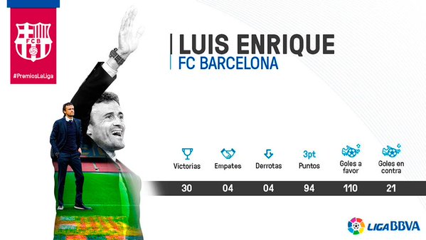 "لويس إنريكي" أفضل مدرب بالليجا الثلاثاء 01/ديسمبر/2015 - 12:04 ص 12/1/2015 12:04:45 AM علي سيف الدين لويس إنريكي حصل "لويس إنريكي" المدير الفني لفريق برشلونة على أفضل مدربٍ في الدوري الإسباني "الليجا" 2014/ 2015.وأقيم الحفل الليلة بحضور كوكبة من نجوم الدوري الإسباني وتم توزيع الجوائز الجماعية والفردية.