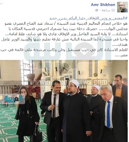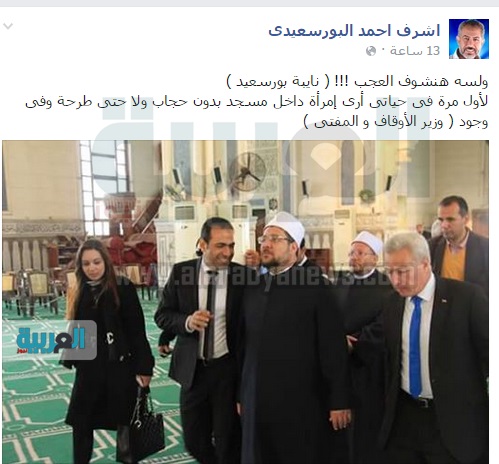 سيطرت حالة من الغضب علي أهالي بورسعيد منذ صباح اليوم السبت عقب انتشار صور لنائبة قائمة في حب مصر ببورسعيد سعاد عبد الفتاح المصرى، وإحدى كوادر حزب مستقبل وطن خلال تواجدها داخل المسجد الكبير ببورفؤاد عارية الرأس دون حجاب أثناء جولة تفقدية للمسجد في وجود كلا من وزير الأوقاف الدكتور محمد مختار جمعة ومفتي الديار المصرية الدكتور شوقي علام.