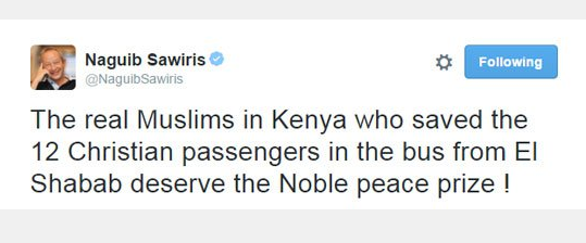 وكتب "ساويرس" في تغريدة له باللغة الإنجليزية، على موقع التواصل الاجتماعي "تويتر": "المسلمون الحقيقيون في كينيا الذين أنقذوا 12 راكبًا مسيحيًا في الهجوم على الحافلة يستحقون جائزة نوبل للسلام".