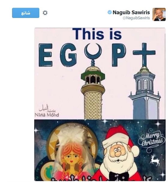 ونشر "ساويرس"، عبر حسابه الشخصى بموقع التواصل الاجتماعى "تويتر"، مساء اليوم الأربعاء، صورة تجمع مسجدًا وكنيسة، بالإضافة إلى عروسة مولد وسانتا كلوز "بابا نويل".