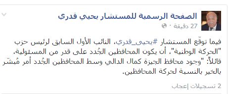 وكتب "قدري" على صفحته الرسمية بموقع التواصل الاجتماعى "فيسبوك بوك" قائلًا: "وجود محافظ الجيزة كمال الدالي، وسط المحافظين الجُدد أمر مُبشّر بالخير بالنسبة لحركة المحافظين".