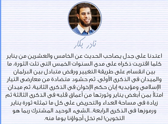 وكتب "بكار" على صفحته الرسمية بموقع التواصل الاجتماعى "فيسبوك": "اعتدنا على جدل يصاحب الحديث عن الخامس والعشرين من يناير كلما اقتربت ذكراه على مدى السنوات الخمس التي تلت الثورة، ما بين انقسام على طريقة التغيير ورفض متبادل بين البرلمان والميدان في الذكرى الأولى، ثم حشود متضادة من معارضى التيار الإسلامى ومؤيديه إبان حكم الإخوان في الذكرى الثانية، ثم ميدان امتلأ بمن أبغض يناير وثورتها من أعماق قلبه في الذكرى الثالثة، ثم زيادة في مساحة العداء والتحريض على كل ما تمثله ثورة يناير ورموزها في الذكرى الرابعة.. الشىء الوحيد المشترك ربما هو التخوين! لم تخل أجواؤنا يومًا منه".
