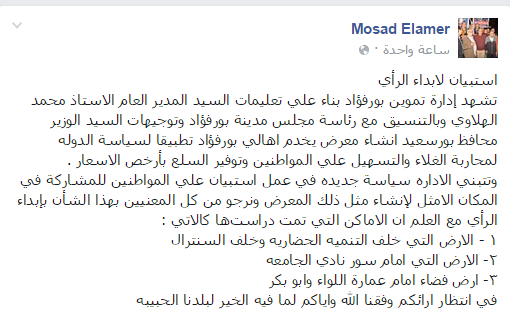 طرح مسعد الأمير كبير مفتشي التموين بمدينة بور فؤاد استبيانا لإبداء الرأي من قبل المواطنين حول وجه نظرهم للمكان الأمثل لإقامة معرض للسلع الغذائية بالمدينة لمحدودي الدخل وذلك بصفته المفوض من قبل مديرية تموين بورسعيد بإنشاء المعرض.