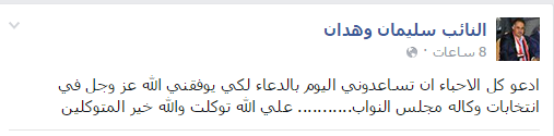 وقال وهدان على صفحته الشخصية بشبكة التواصل الاجتماعي الفيس بوك "ادعو كل الأـحباء أن تساعدوني اليوم بالدعاء لكي يوفقني الله عز وجل في انتخابات وكالة مجلس النواب على الله توكلت والله خير المتوكلين".