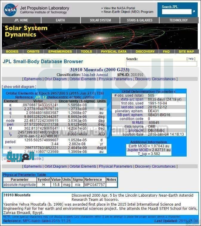 أطلقت وكالة ناسا لعلوم الفضاء اليوم على كوكب جديد اسم "مصطفى" تكريمًا للباحثة ياسمين يحيى مصطفى الأولى على العالم في مجال البحث العلمي للعلوم البيئية من مواليد مركز كفر سعد بمحافظة دمياط، الفائزة بالمركز الأول على مستوى العالم في مجال علوم البيئة خلال مسابقة "إنتل ايسفط الدولية للعلوم والهندسة 2015 المقامة بمعرض انتل بمدينة بيتسبرج التابعة لولاية بنسلفانيا الأمريكية.