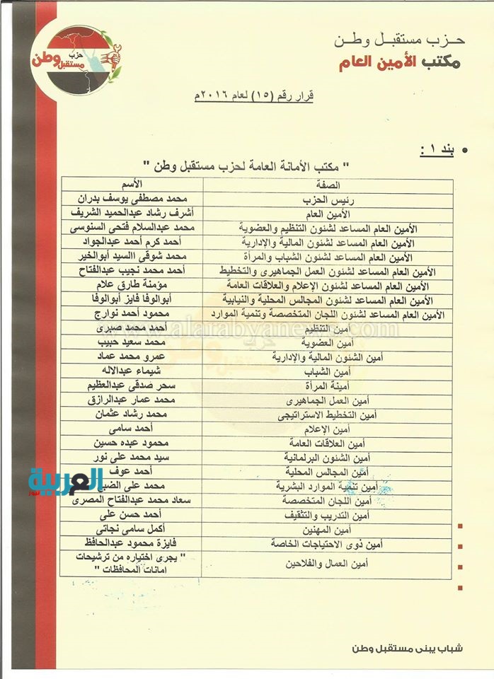 حصلت "العربية نيوز" على نسخة من القرار رقم "15" من حزب مستقبل وطن لعام 2016، والذي تم من خلاله إعلان تشكيل الأمانة العامة للحزب.