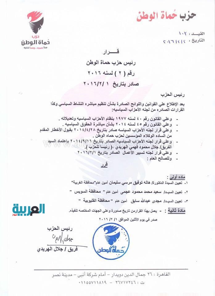 وتضمن القرار اعتماد اللواء مصطفى فتوح مساعد رئيس الحزب لشئون التجارة والصناعة والدكتورة هالة توفيق مرسى سليمان أمينًا عاما للحزب بمحافظة الغربية وسعيد محمد محمود عجمى أمينًا عامًا للحزب بمحافظة السويس.