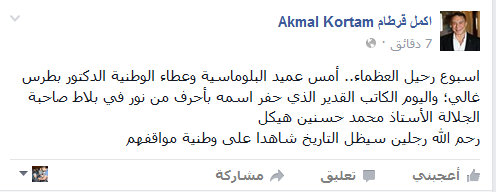 وأضاف قرطام عبر صفحته الرسمية على موقع التواصل الاجتماعي "فيس بوك"، أننا أمس فقدنا عميد الدبلوماسية وعطاء الوطنية الدكتور بطرس غالي، واليوم توفى الكاتب القدير الذي حفر اسمه بأحرف من نور في بلاط صاحبة الجلالة الأستاذ محمد حسنين هيكل.