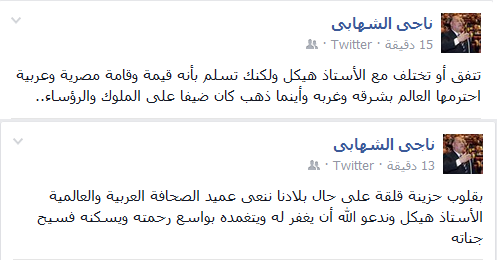 وأضاف الشهابي عبر صفحته الرسمية على موقع التواصل الاجتماعي "فيس بوك"، عاش الأستاذ هيكل بجوار جمال عبد الناصر لم يكن مجرد كاتبا ومحللا وصديقا، بل كان شريكا معه في الحكم ولم يسجل التاريخ حالة مثل حالة هيكل وناصر.