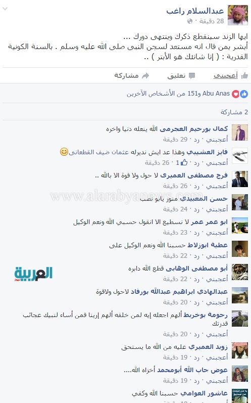 أبشر بمن قال إنه "مستعد لسجن النبى صلى الله عليه وسلم، بالسنة الكونية القدرية": "إنا شانئك هو الأبتر".