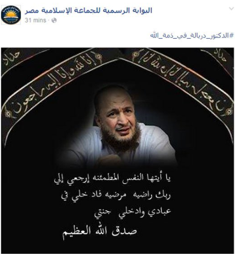 أعلنت الجماعة الإسلامية، عبر صفحتها على موقع التواصل الاجتماعي "فيس بوك"، عن وفاة عصام دربالة، رئيس مجلس شورى الجماعة السابق، في محبسه، كما أعلنت صفحة حزب البناء والتنمية على "فيس بوك"، عن الوفاة.