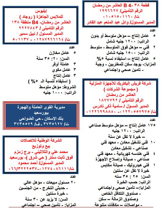 تقدم الطلبات بالمصانع والشركات مباشرة من خلال أرقام التليفونات الموجودة بكل وظيفة أو بوزارة القوى العاملة والهجرة 3 شارع يوسف عباس مدينة نصر ولمزيد من المعلومات يمكنك الإتصال على الأرقام 22609354، أو الإتصال مباشرة بالأرقام الموجودة بكل وظيفة.