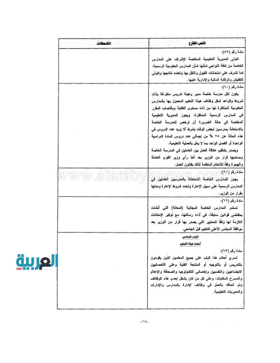 وتنشر "العربية نيوز" نصوص مواد قانون التعليم الجديد.