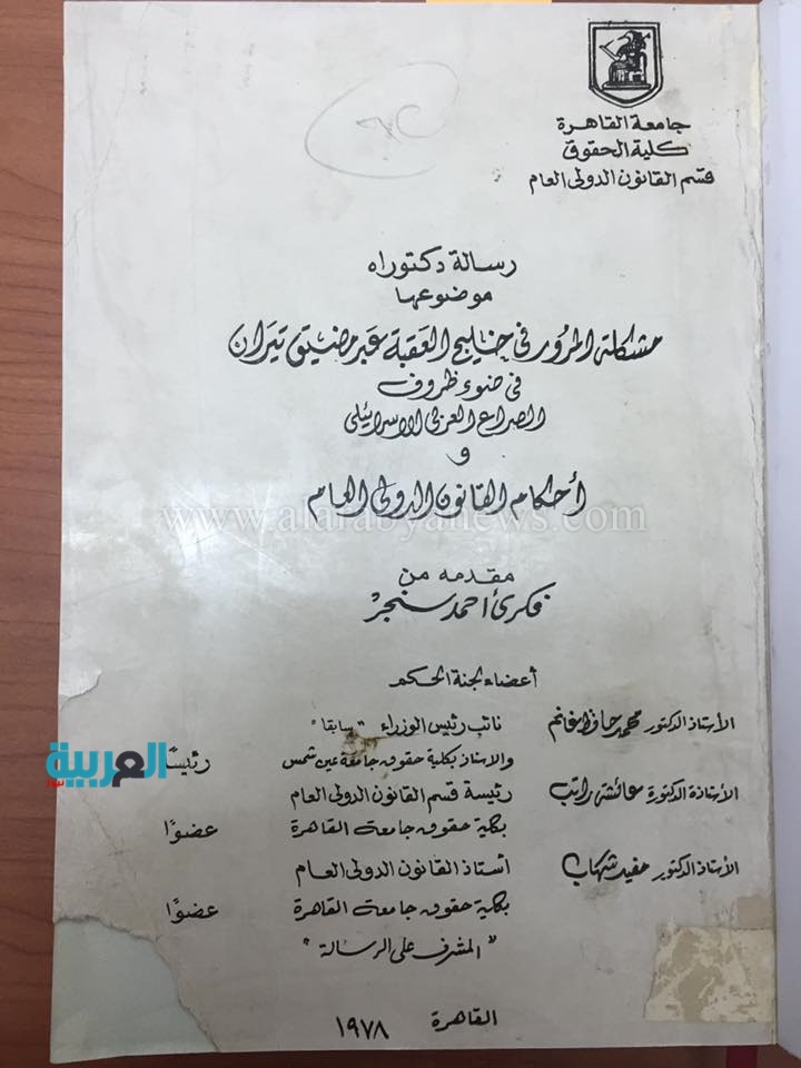 3_ رسالة دكتوراة لفكرى أحمد سنجر عام 1978، أشرف عليها الدكتور مفيد شهاب الدين والوارد بها رسائل الملك عبد العزيز لسفير السعودية بالقاهرة، والباحث يؤكد مصرية الجزيرتين.