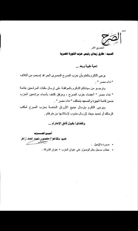 تقدم حزب "الصرح" باستقالة مكتوبة إلى طارق زيدان، رئيس حزب "الثورة المصرية"، ومقرر ائتلاف "نداء مصر""للانسحاب من التحالف الانتخابى "نداء مصر".