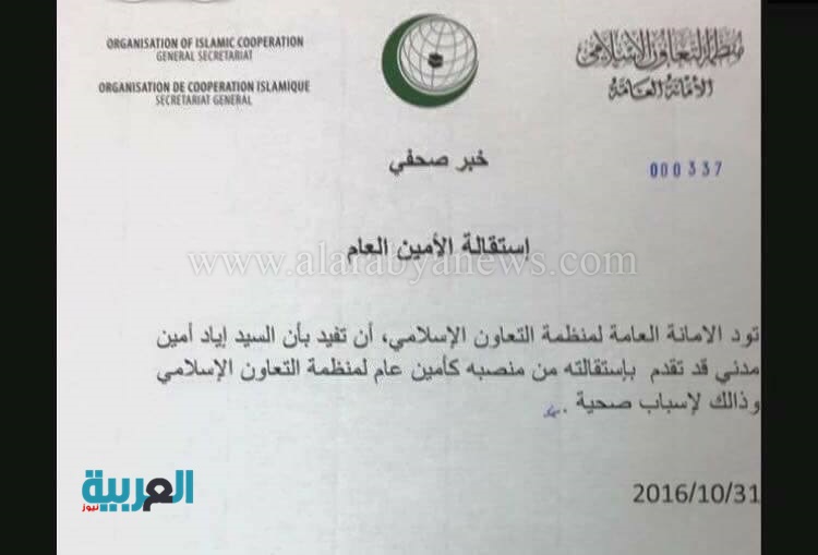 اياد مدني يتقدم بإستقالته من منصبه بمنظمة التعاون الإسلامي الإثنين 31/أكتوبر/2016 - 09:51 م 10/31/2016 9:51:12 PM إياد أمين مدني أعلنت الامانة العامة لمنظمة التعاون الإسلامي، بأن إياد أمين مدني قد تقدم بإستقالته من منصبه كأمين عام لمنظمة التعاون الإسلامي.وقالت المنظمة في بيان لها إن مدني أستقال لأسباب صحية. امانة الاسلام