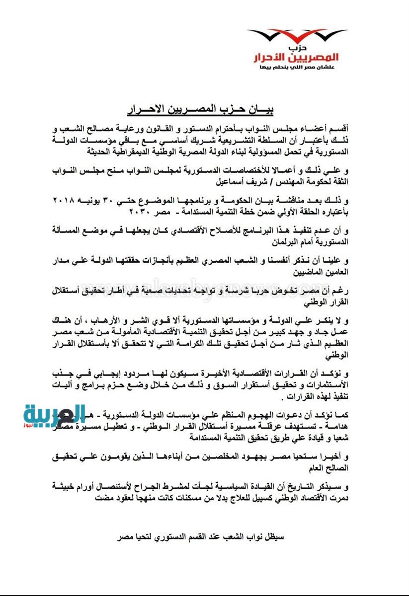 حزب "المصريين الأحرار" يكشف موقفه النهائي من قرارات الحكومة الأخيرة السبت 05/نوفمبر/2016 - 06:44 م 11/5/2016 6:44:39 PM إسلام شعراوي "المصريين الأحرار" أصدر حزب "المصريين الأحرار" بيان عاجل حول موقف الائتلاف من قرارات حكومة المهندس شريف إسماعيل الأخيرة. حزب المصريين الاحرار