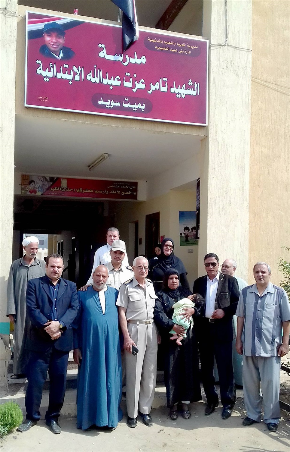 شهد الأستاذ عاطف فؤاد نائب رئيس مركز ومدينة بنى عبيد و الدكتور عادل يحيى مدير إدارة بنى عبيد التعليمية فعاليات إطلاق اسم الشهيد تامر عزت عبد الله أحمد على مدرسة ميت سويد الإبتدائية الجديدة المتواجدة بقرية ميت سويد التابعة للمركز لتصبح مدرسة الشهيد تامر عزت عبد الله فى حضور والده ووالدته وعدد من أفراد أسرة الشهيد.