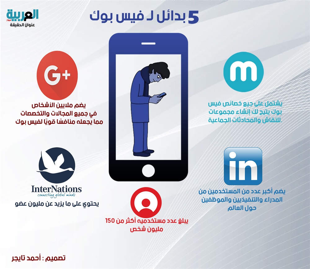 إنفو جراف.. 5 بدائل لـ"فيس بوك" الأحد 06/مايو/2018 - 04:51 م 5/6/2018 4:51:12 PM تصميم: احمد تايجر صورة أرشيفية نانسى فيس بوك