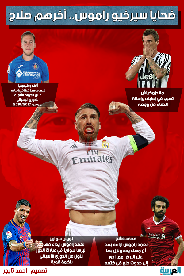 إنفوجراف.. ضحايا سيرخيو راموس.. آخرهم "صلاح" الإثنين 28/مايو/2018 - 12:59 م 5/28/2018 12:59:01 PM تصميم: احمد تايجر سيرخيو راموس راموس