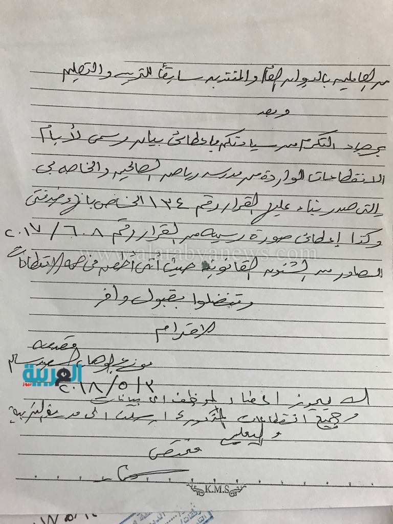 وأضافت ان كل ماسبق يؤكد على المؤامرة التي احيكت ضدى من قبل مفتاح جالون مدير مدرسة رياض الصالحين الذى ابلغ عن انقطاعى بفترة اجازتى المرضيه رغم استلام إدارة المدرسة اصل الاجازة مرورا بمدير إدارة مطروح التعليمية وموظفى شئون العاملين الذين فقدوا ضميرهم وارسلوا بيانات كاذبه لانهاء خدمتى وكذا موظفي الشئون القانونيه بالاداره التعليمه المفترض فيهم الحيادية وتحقيق العدل اشتركوا عامدين متعمدين متجردين من اى وازع انسانى او دينى ومرورا بوكيل الوزاره الذى ينفذ تعليمات المحافظ ويقدم له الضحيه على طبق من فضه حتى بقتص منها وينهى خدمتها إرضاء لغروره وجعلها عبرة لمن لايعتبر.