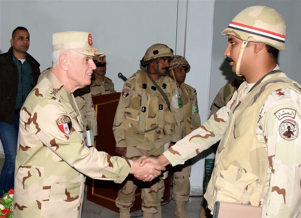 ونقل الفريق / محمد فريد تحية وتقدير السيد الرئيس / عبد الفتاح السيسى رئيس الجمهورية القائد الأعلى لللقوات المسلحة والفريق أول / محمد ذكى القائد العام للقوات المسلحة وزير الدفاع والإنتاج الحربى بمقاتلى الجيش الثالث الميدانى مشيداً بدورهم البطولى فى الدفاع عن أرض الوطن خلال مراحل العملية الشاملة سيناء 2018 وما يتمتعون به من روح معنوية عالية وإستعداد دائم للبذل والتضحية من أجل أمن وسلامة مصر وشعبها العظيم .