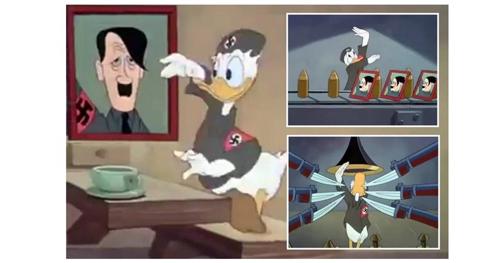 في فيلم قصير ضد النازية، يُجبر دونالد داك على الانضمام إلى جيش هيتلر وتنفيذ طلباته، ليستيقظ بآخر الحلقة ويضم تمثال الحرية، ديزني منعت الفيلم لاحقًا معتبرة أنّ الأولاد لا يمكنهم أن يغوصوا بالسياسة لهذه الدرجة.