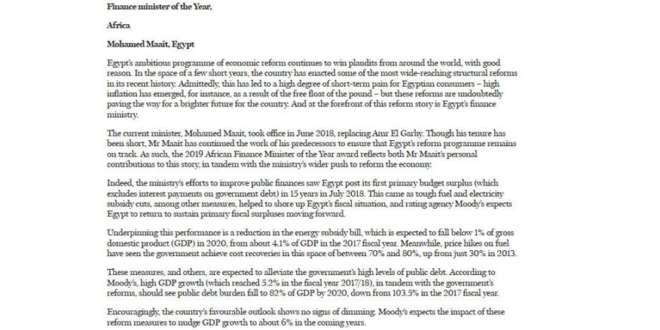 واوضحت ان الدكتور محمد معيط استمر في تنفيذ سياسات الاصلاح التي تبنتها الحكومات المصرية في السنوات الاربع الاخيرة ووزير الذي سبقه السيد عمرو الجارحي واكدت ذا بنكر ان الدكتور محمد معيط حرص علي بقاء برنامج الإصلاح في مصر على المسار الصحيح، ولذلك فإن جائزة أفضل وزير مالية لعام 2019 تعكس مساهمات الدكتور معيط الشخصية بالتوازي مع الدفع الأوسع من قبل الوزارة من أجل إصلاح الاقتصاد، حيث شهدت المالية العامة في مصر تحسن واضح في الاداء لتحقق لاول مرة منذ 15 عاما فائض اولي بالموازنة العامة في يوليو 2018، وجاء هذا الفائض في ظل سياسات اصلاح برامج دعم الطاقة والتي شملت الوقود والكهرباء، والتي ادت الي تقلص فاتورة دعم الطاقة لتنخفض من نحو 4.1% من الناتج المحلي لعام 2017 الي اقل من 1% من الناتج بحلول عام 2020.