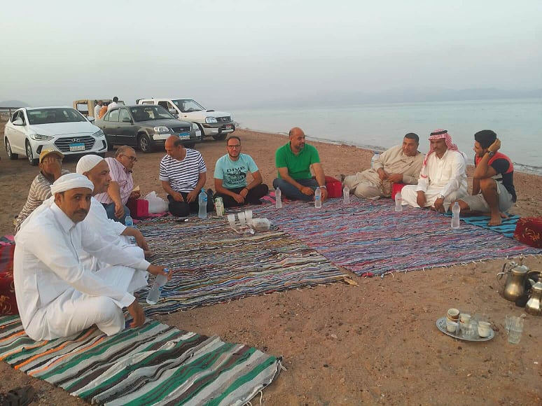 تشتهر دهب تحديدا بثماني قبائل لبدو سيناء وهي من اكبر قبائل جنوب سيناء ‘وتستعد تلك القبائل قبل بدء الشهر الكريم بأيام قليلة، وتجهز قوائم الإفطار الجماعية، باعتبارها أبرز عادات وتقاليد بدو سيناء خلال شهر رمضان، فتعتاد القبائل على تجمع الرجال في مكان واحد، وقبل الإفطار يذهبوا على شواطئ دهب ويكون الإفطار على البحر ويأتى كل رجل بإفطاره، حيث يجتمع كل أبناء العشيرة من الشباب والرجال والشيوخ ويصطحب كل رجل أبناءه ليعتادوا على تلك التقاليد الموروثة خلال شهر رمضان‘ اما الضيف فله منهم معاملة خاصة فيحرسوا على أن يكون في ضيافة ومائدة خاصة به ‘وعند أذان المغرب يقومون للصلاة بعد توزيع التمر والمياه والعصائر ثم يقبلون على المائدة مرة اخرى فيأكل كل فرد من جميع الأطباق الموجودة دون أي فارق بين طعام هذا وذاك ‘ في مشهد عظيم ‘ويسبق إعداد الإفطار إشعال النيران والمواقد المتوهجة لاستخدامها في إعداد الشاى والقهوة بعد الإفطار في مظهر يقر العين فدائما الإفطار على البحر له مذاق وطعم خاص‘