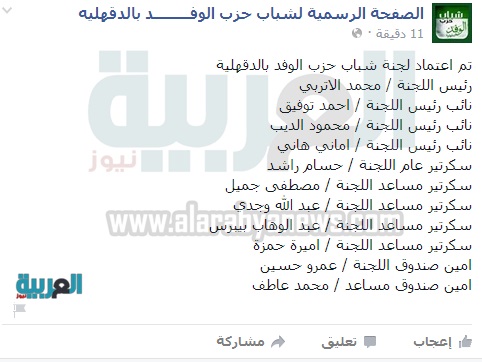 أعلن حزب الوفد بالدقهلية، على صفحته الرسمية بـ "فيس بوك" عن اعتماد لجنة الشباب بالمحافظة، حيث تم اختيار محمد الأتربي، رئيسا للجنة، وأحمد توفيق، ومحمود الديب نوابا عن رئيس اللجنة.