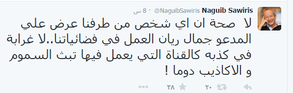 حيث قال "ساويرس" في تغريدة له على موقع التواصل الاجتماعي "تويتر" إنه: "لا صحة أن أي شخص من طرفنا عرض على المدعو جمال ريان العمل في فضائياتنا "لا غرابة في كذبه كالقناة التي يعمل فيها تبث السموم والأكاذيب دوما".
