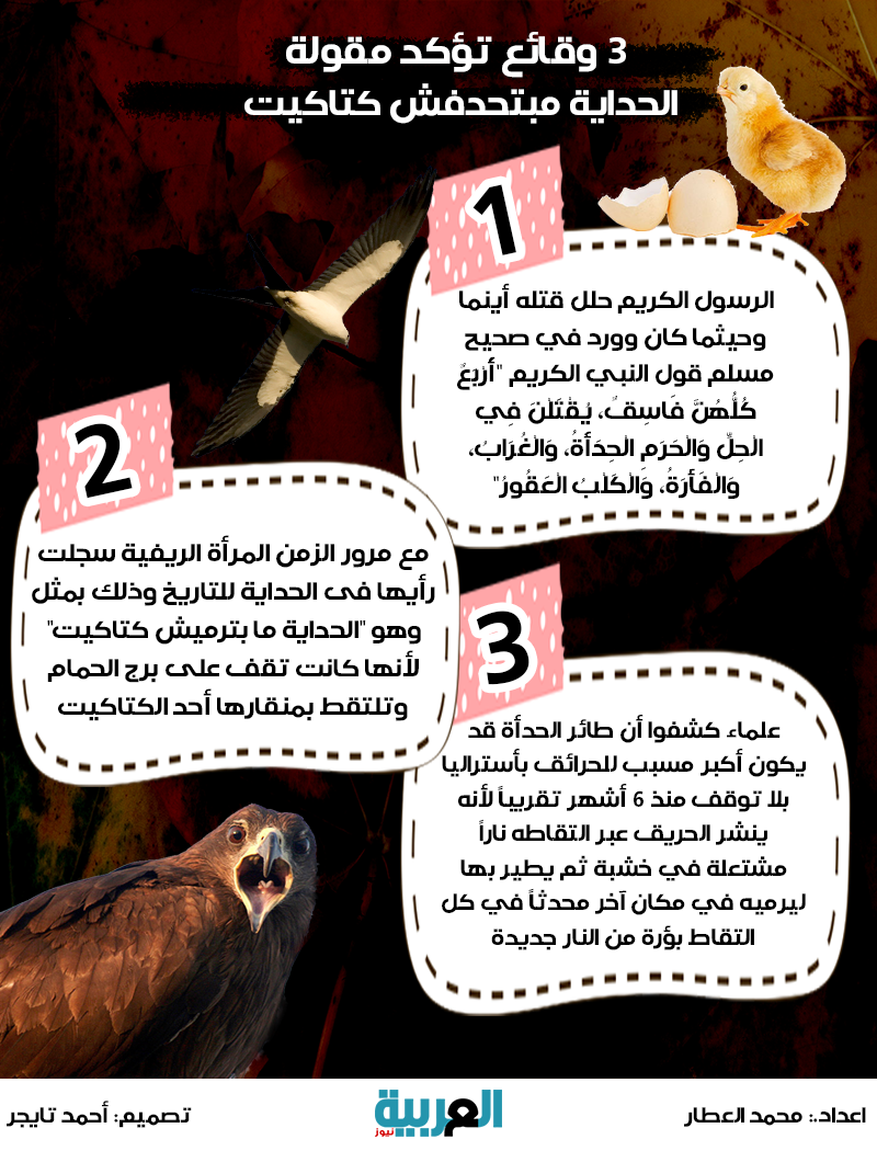 إنفوجراف.. 3 وقائع تؤكد مقولة "الحداية مبتحدفش كتاكيت" الإثنين 06/يناير/2020 - 10:46 م 1/6/2020 10:46:49 PM إعداد: محمد العطار - تصميم: أحمد تايجر طائر الحداية "الحداية مبتحدفش كتاكيت".. مثل شعبي شهير أثبت الأذى الذي تتسبب فيه الحدأة "الحداية" في المجتمع، وهناك وقائع شهدها التاريخ أكدت تلك المقولة نقدمها في الإنفو جراف التالي.