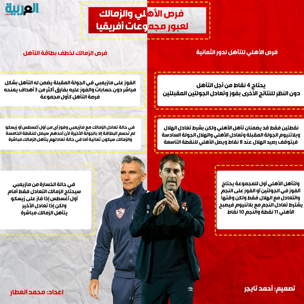 إنفوجراف.. فرص الأهلي والزمالك لعبور مجموعات أفريقيا الأحد 12/يناير/2020 - 05:57 م 1/12/2020 5:57:21 PM إعداد: محمد العطار - تصميم: أحمد تايجر وصل كل من الأهلي والزمالك للنقطة السابعة في مجموعاتهم بدوري أبطال أفريقيا ليحتل كلا في مجموعته المركز الثاني في حين أن موقف الزمالك أسهل من الأهلي لعبور مجموعته.