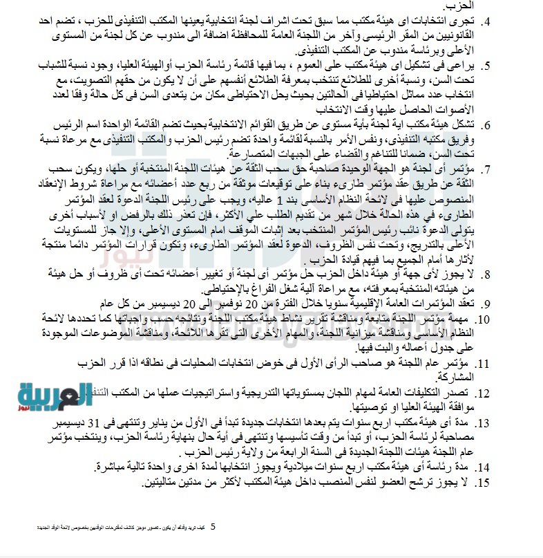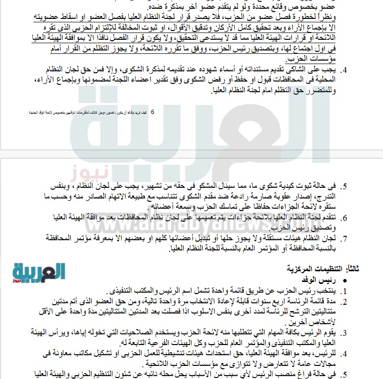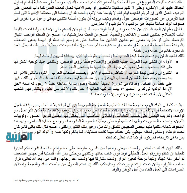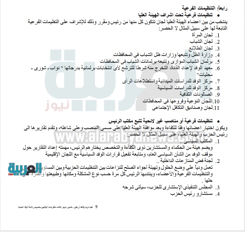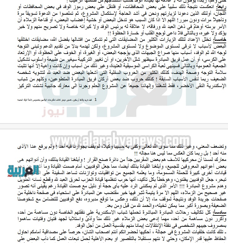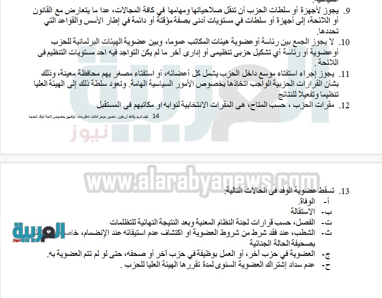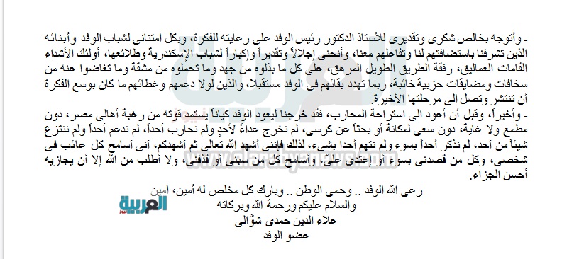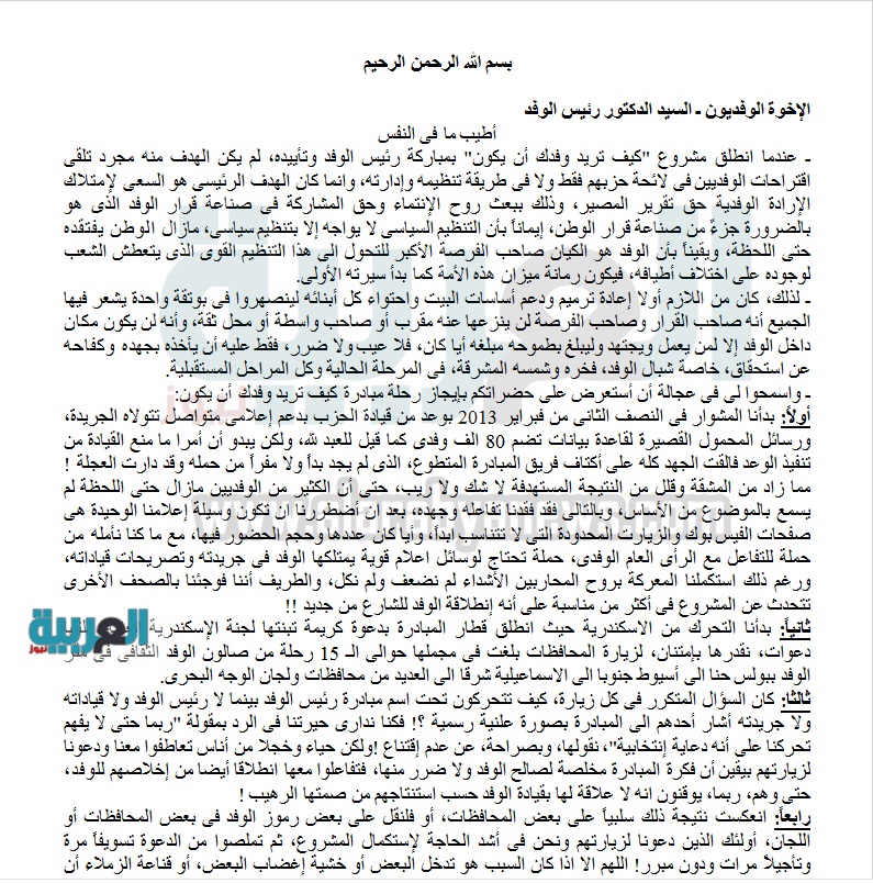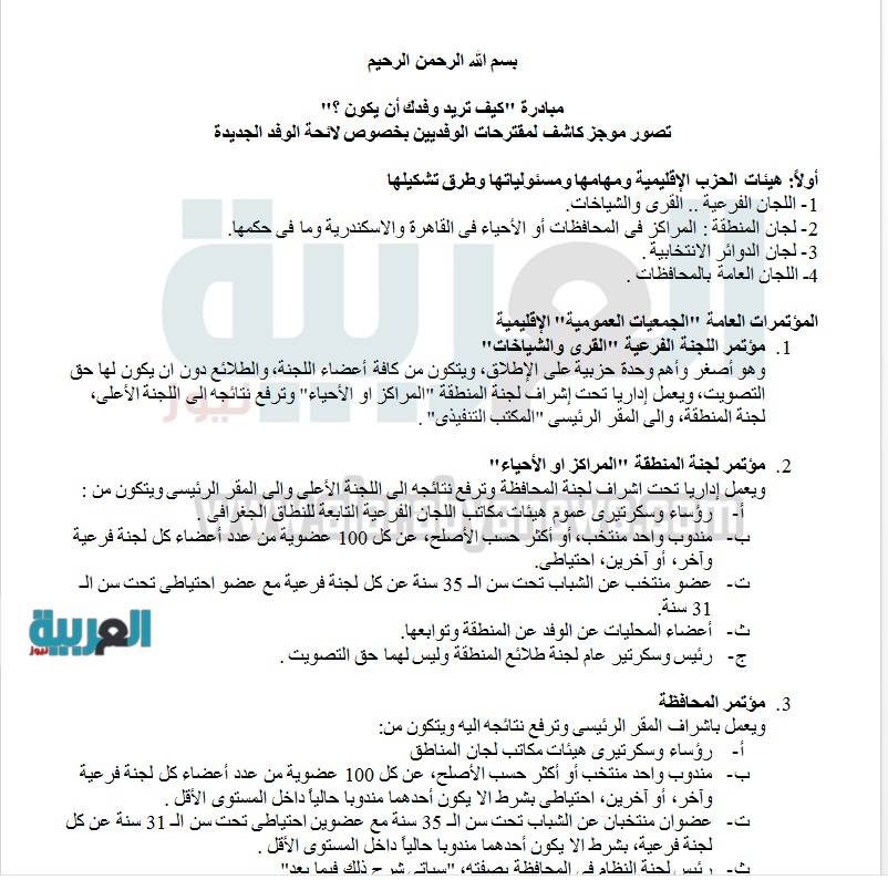 وفى هذا السياق تمكنت "العربية نيوز" من الحصول على نسخة من مبادرة "كيف تريد وفدك أن يكون" والتى سرقت من صاحبها "علاء الدين شوالى" قبل تركه للحزب.