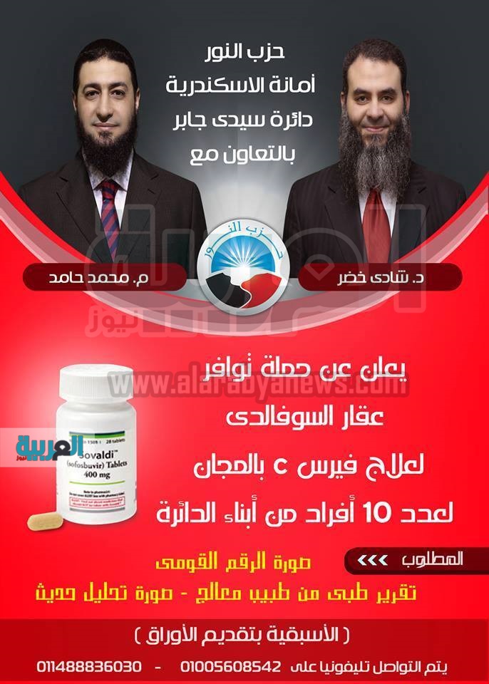 حذف مسئولو حزب النور بالإسكندرية الإعلان الذي سبق ونشروه على صفحتهم الرسمية على موقع التواصل "فيس بوك"، بتوفير عقار "سوفالدي" بمقر الحزب بدائرة سيدي جابر لعلاج مرضى الالتهاب الكبدي الوبائي، بعد إعلان وزارة الصحة بحظر تداول العقار بأي مقر حزبي أو انتخابي بعيدا عن مؤسسات ومديريات وزارة الصحة.