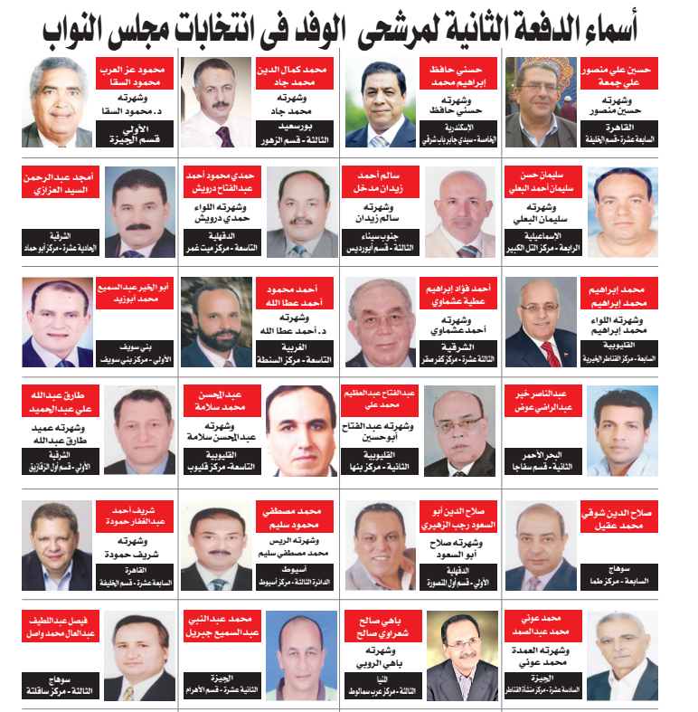 ودفع "الوفد" فى محافظة القليوبية بكلاً من؛ اللواء محمد إبراهيم عن دائرة مركز القناطر الخيرية، وعبدالفتاح أبو حسين عن دائرة مركز بنها، وعبدالمحسن سلامة عن دائرة مركز قليوب، وفى محافظة الغربية ترشح أحمد عطا الله عن مركز السنطة، وعن محافظة بنى سويف، ترشح أبو الخير أبو زيد عن مركز بنى سويف، وعوض عبدالحميد عن مركز سمسطا، وفى محافظة البحر الأحمر ترشح عبدالناصر عوض عن دائرة قسم سفاجا، وترشح فى محافظة سوهاج، صلاح الدين عقيل عن دائرة مركز طما، وفيصل عبدالعال عن دائرة مركز ساقلتة، وترشح فى محافظة أسيوط محمد مصطفى سليم عن دائرة مركز أسيوط، وتقدم باهى الروبى فى محافظة المنيا عن دائرة مركز سمالوط.