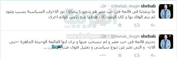 وأضاف وجيه، علي حسابه الشخصي علي موقع التواصل الاجتماعي "تويتر": أن ما يزعج الحزب من قائمة "في حب مصر" هو تضاؤل دور الأحزاب السياسية، مشيراً إلي الوعود التي كانت بينهم وبين القائمة المتمثلة في عدم تكوين قوائم أخري.