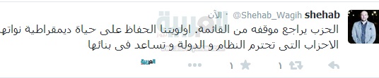 كما أكد وجيه، أن الحزب يراجع موقفه من القائمة، مؤكداً أن أولوياته تتمثل في الحفاظ على حياة ديمقراطية نواتها الأحزاب التى تحترم النظام و الدولة و تساعد فى بنائها.