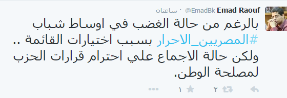 وكتب رؤوف، على موقع التدوين العالمي "تويتر"، إنه "بالرغم من حالة الغضب في أوساط شباب المصريين الأحرار بسبب اختيارات القائمة، لكن حالة الإجماع على احترام قرارات الحزب لمصلحة الوطن".