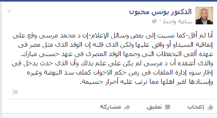 وأضاف مخيون قائلا: "والذى أعتقده أن الدكتور محمد مرسى لم يكن على علم بذلك، وأن الذى حدث يدخل فى إطار سوء إدارة الملفات فى زمن حكم اﻻخوان كملف سد النهضة وغيره وإسنادها لغير أهلها ما ترتب عليه أضرار جسيمة".