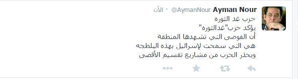 أكد أيمن نور، رئيس حزب غد الثورة، أن الفوضى التي تشهدها المنطقة العربية، فى هذه الفترة هي التي سمحت لإسرائيل بفرض هذه البلطجة على البلاد.