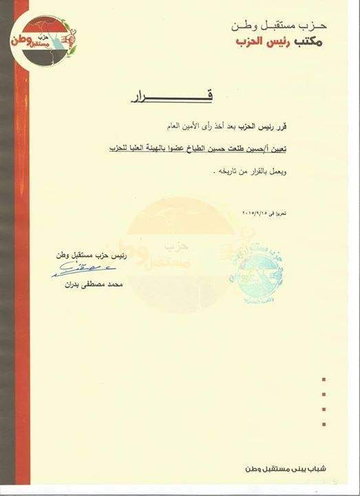 أصدر حزب مستقبل وطن برئاسة محمد بدران، قرارًا اليوم الثلاثاء، بعد أخذ رأي الأمين العام، بتعيين حسين طلعت حسين الطباخ، عضوًا بالهيئة العليا للحزب.