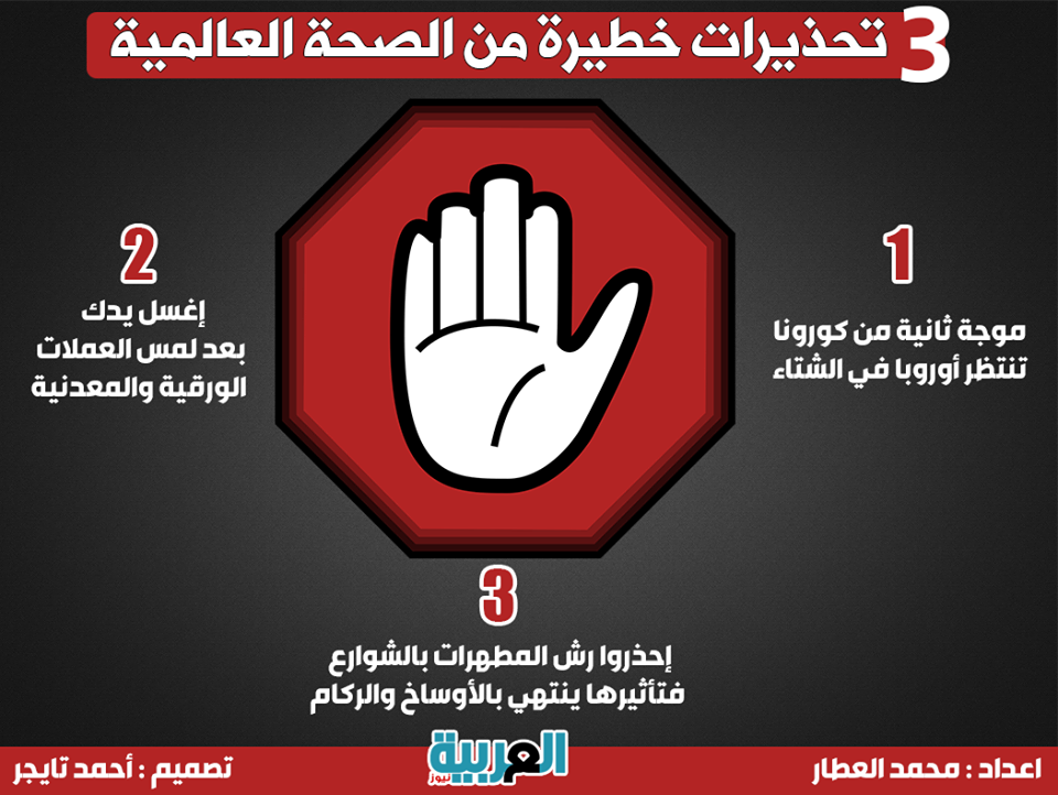 إنفوجراف.. 3 تحذيرات خطيرة من الصحة العالمية الأحد 17/مايو/2020 - 03:40 م 5/17/2020 3:40:01 PM إعداد: محمد العطار - تصميم: أحمد تايجر صورة أرشيفية حذرت منظمة الصحة العالمية من عدة تصرفات وفقا لمتابعتها لفيروس كورونا خلال الفترة الأخيرة.