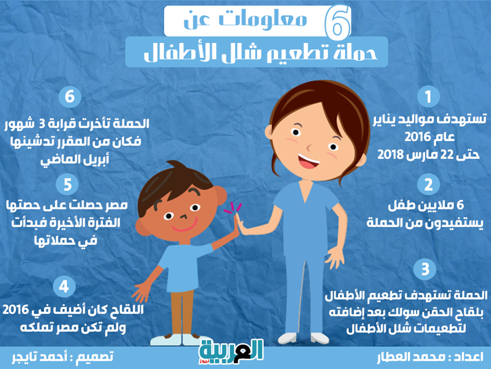 إنفوجراف.. 6 معلومات عن حملة تطعيم شلل الأطفال الأربعاء 01/يوليو/2020 - 03:26 م 7/1/2020 3:26:16 PM إعداد: محمد العطار - تصميم: أحمد تايجر بدأت اليوم حملة وزارة الصحة ضد شلل الأطفال في عدد من المحافظات، وسط اهتمام الأهالي بها للعمل على وقاية أطفالهم.