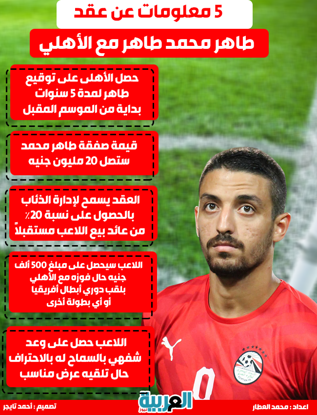إنفوجراف.. 5 معلومات عن عقد طاهر محمد طاهر مع الأهلي الثلاثاء 07/يوليو/2020 - 06:41 م 7/7/2020 6:41:55 PM إعداد: محمد العطار - تصميم: احمد تايجر أعلن النادى الأهلى رسميا ضم طاهر محمد طاهر لاعب المقاولون، وفي الإنفوجراف الآتي تقدم "العربية نيوز" أبرز المعلومات عن العقد بين الطرفين.