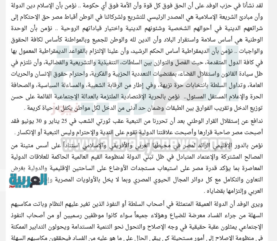 واستطاعت "العربية نيوز" الحصول على نسخة مصورة من البرنامج الانتخابي للحزب، والذي يتضمن 16 بندًا، يتناول كل بند قضية محددة، وطريقة الحزب في التعامل معها.