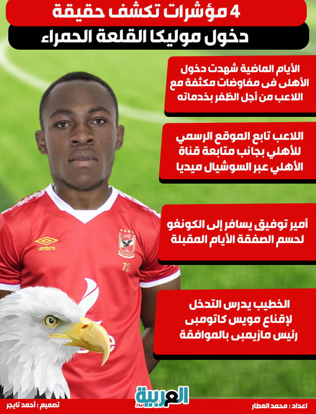 إنفوجراف.. 4 مؤشرات تكشف حقيقة دخول "موليكا" القلعة الحمراء الأحد 12/يوليو/2020 - 04:33 م 7/12/2020 4:33:42 PM إعداد: محمد العطار - تصميم: احمد تايجر جاكسون موليكا في الساعات الأخيرة، انتشر معلومات بشأن انضمام جاكسون موليكا نجم مازيمبي الكونغولي إلى النادي الأهلي، بسبب عدد من المؤشرات.